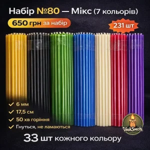 Набір еластичних воскових свічок мікс №80 «Веселка» (231 шт) — 7 кольорів для скруток та ритуалі