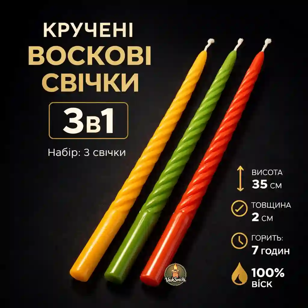Набір воскових свічок від VoskSvechi — це ідеальне поєднання витонченої форми та природної енергії. Кожна свічка має унікальне спіральне плетіння, що створює неймовірну гру світла та тіні під час горіння. Виготовлені зі 100% натурального воску, вони наповнюють оселю м’яким медовим ароматом, створюючи атмосферу затишку та гармонії.