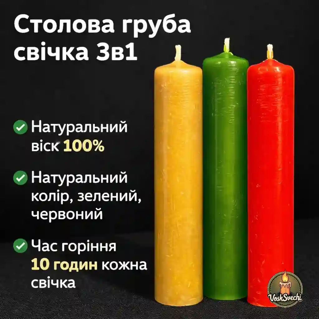 Відкрийте для себе багатогранність натурального вогню з брендом VoskSvechi. Цей ексклюзивний набір поєднує в собі три потужні столові свічки символічних кольорів: природний **натуральний**, затишний **зелений** та пристрасний **червоний**. Кожна свічка — це витвір ручної роботи, створений, щоб наповнити ваш простір теплом та медовим ароматом.
