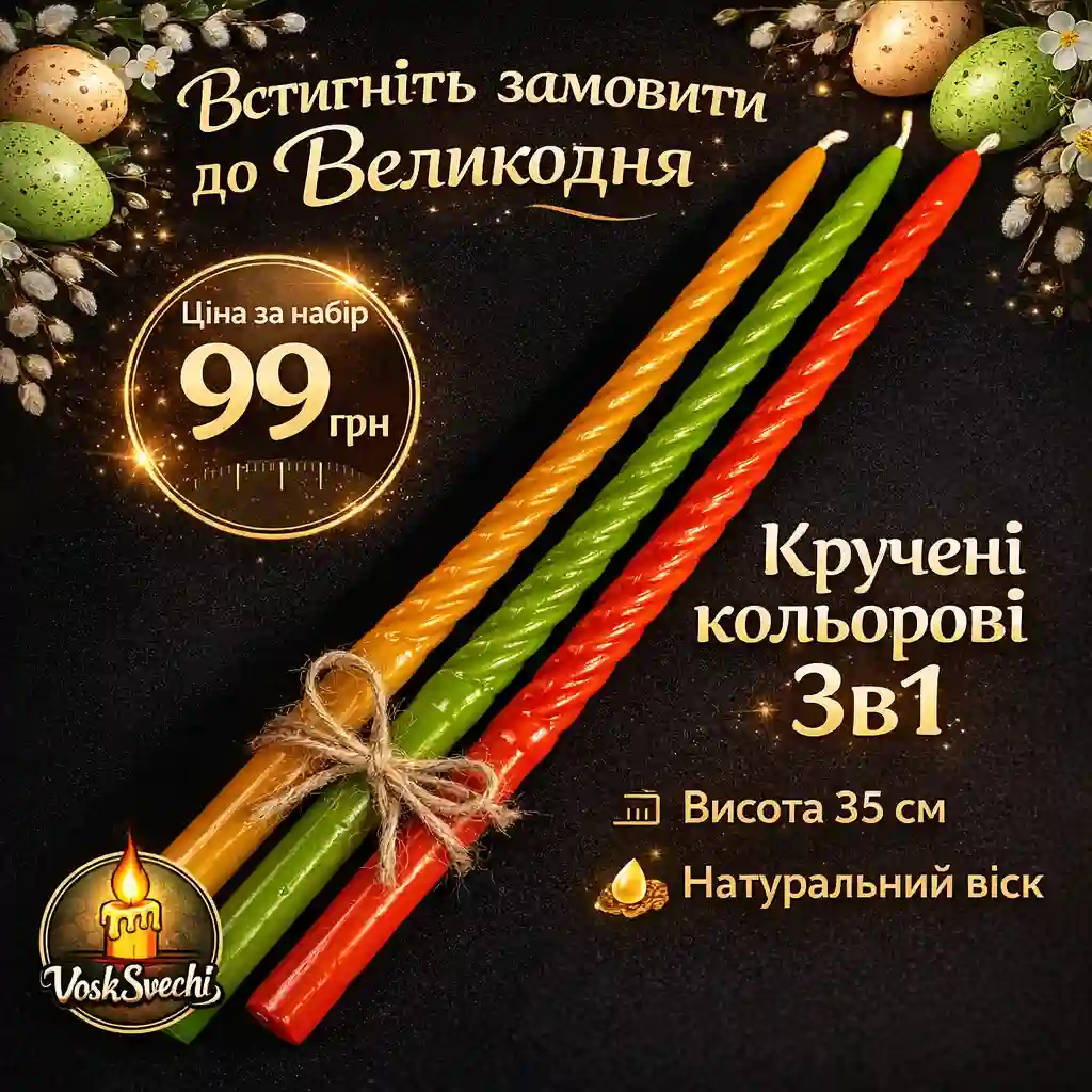 Свічки «Святкові кручені» від VoskSvechi створені спеціально до Великодня. Це унікальний мікс трьох насичених кольорів: символічного червоного, сонячного жовтого та свіжого зеленого. Виготовлені з чистого воску, вони випромінюють густий медовий аромат, наповнюючи оселю справжньою святковою благодаттю.