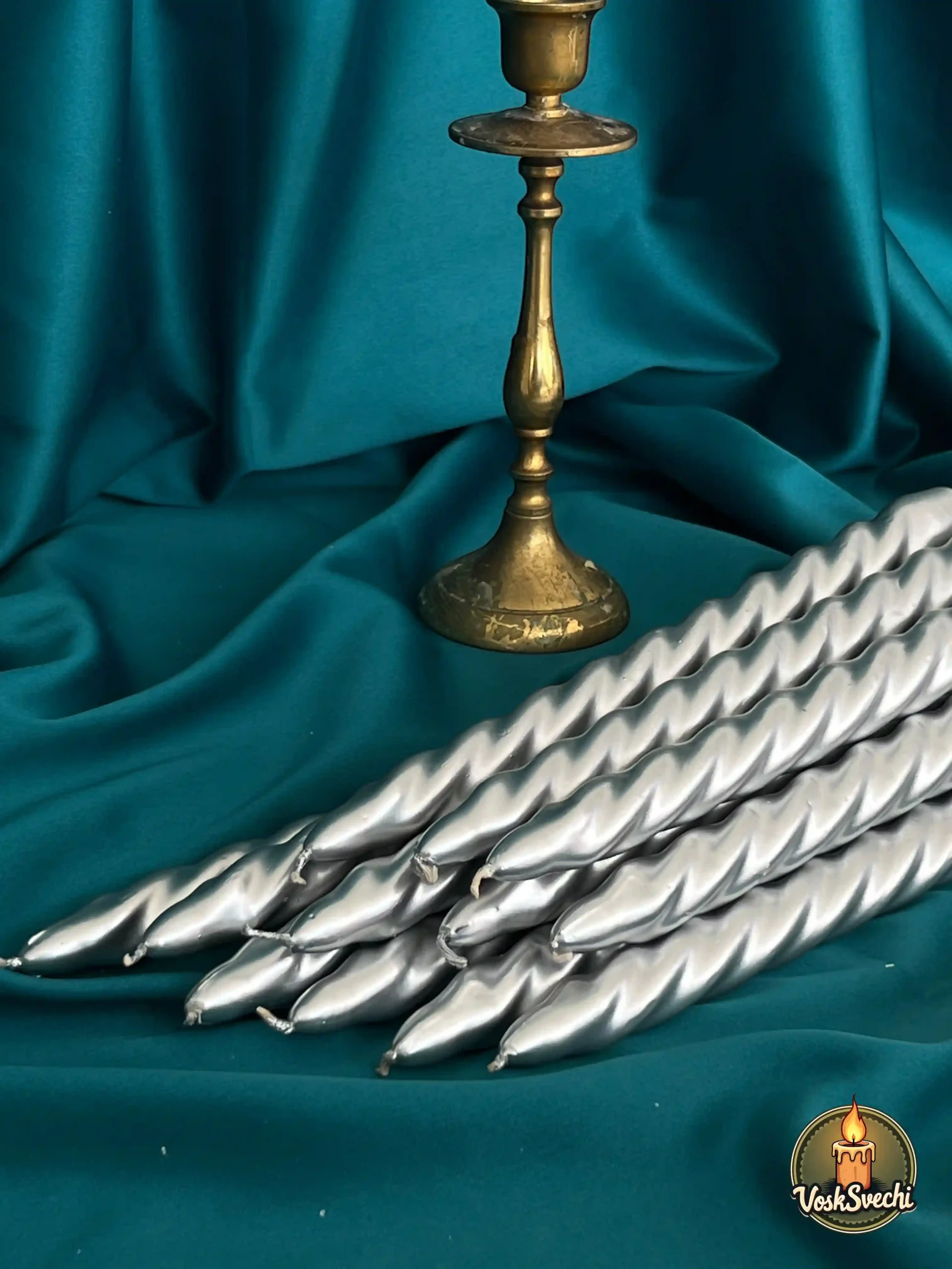 Відкрийте для себе магію холодного металевого блиску з нашими срібними свічками. Спіральна форма підкреслює сучасний стиль, а дзеркальне напилення створює розкішні відблиски під час горіння. Ці свічки стануть ідеальним доповненням до святкового столу в стилі “модерн”, новорічного декору або вишуканої фотозони.