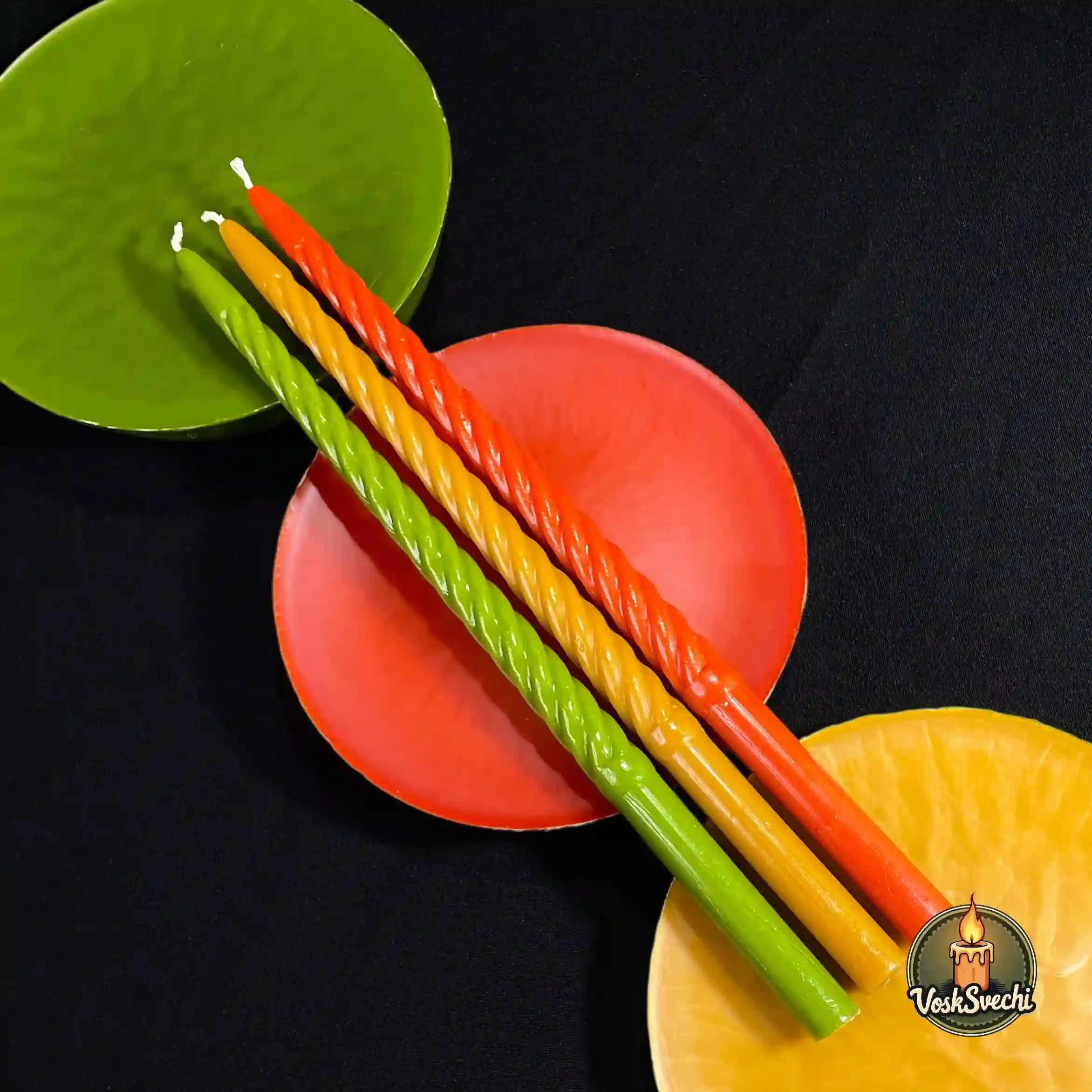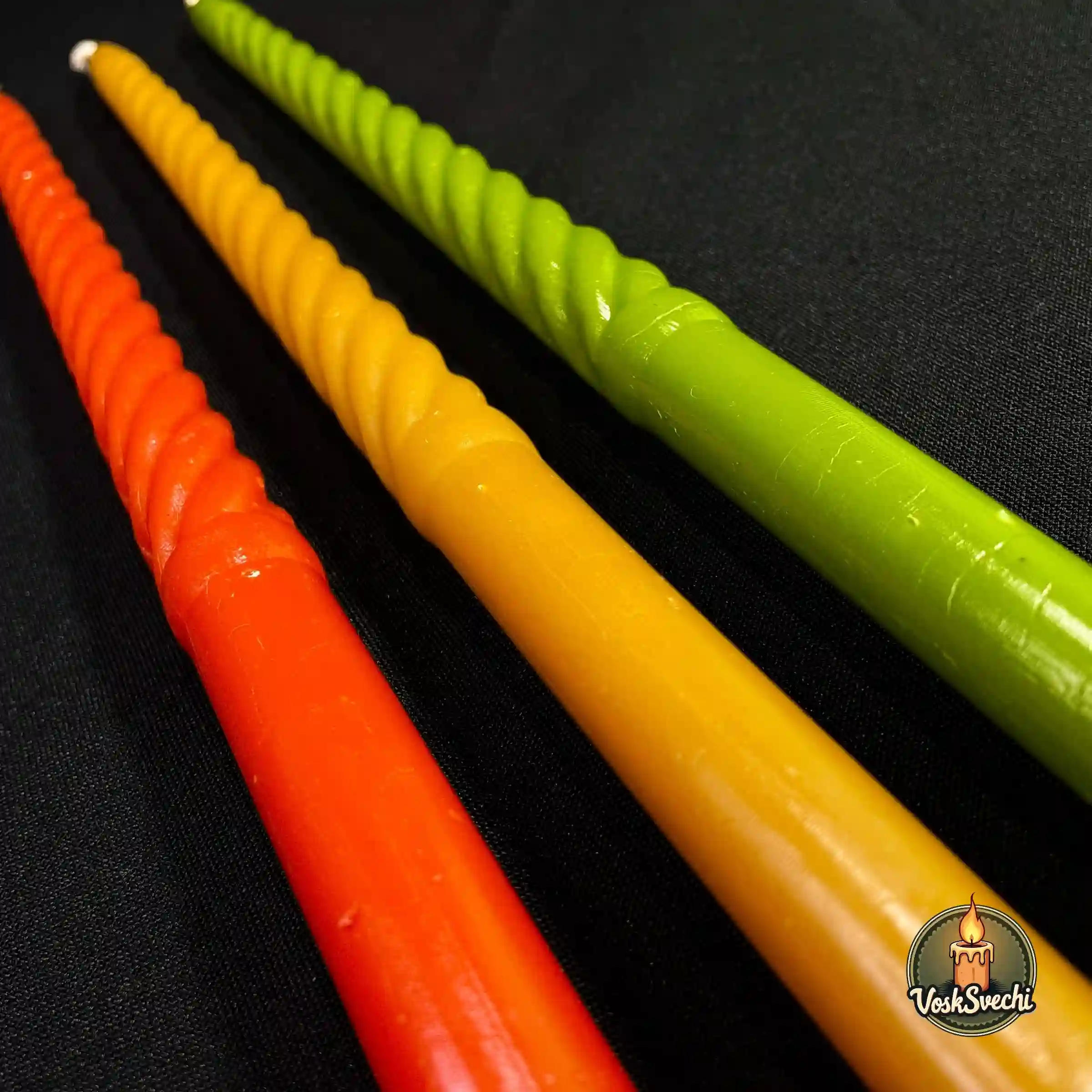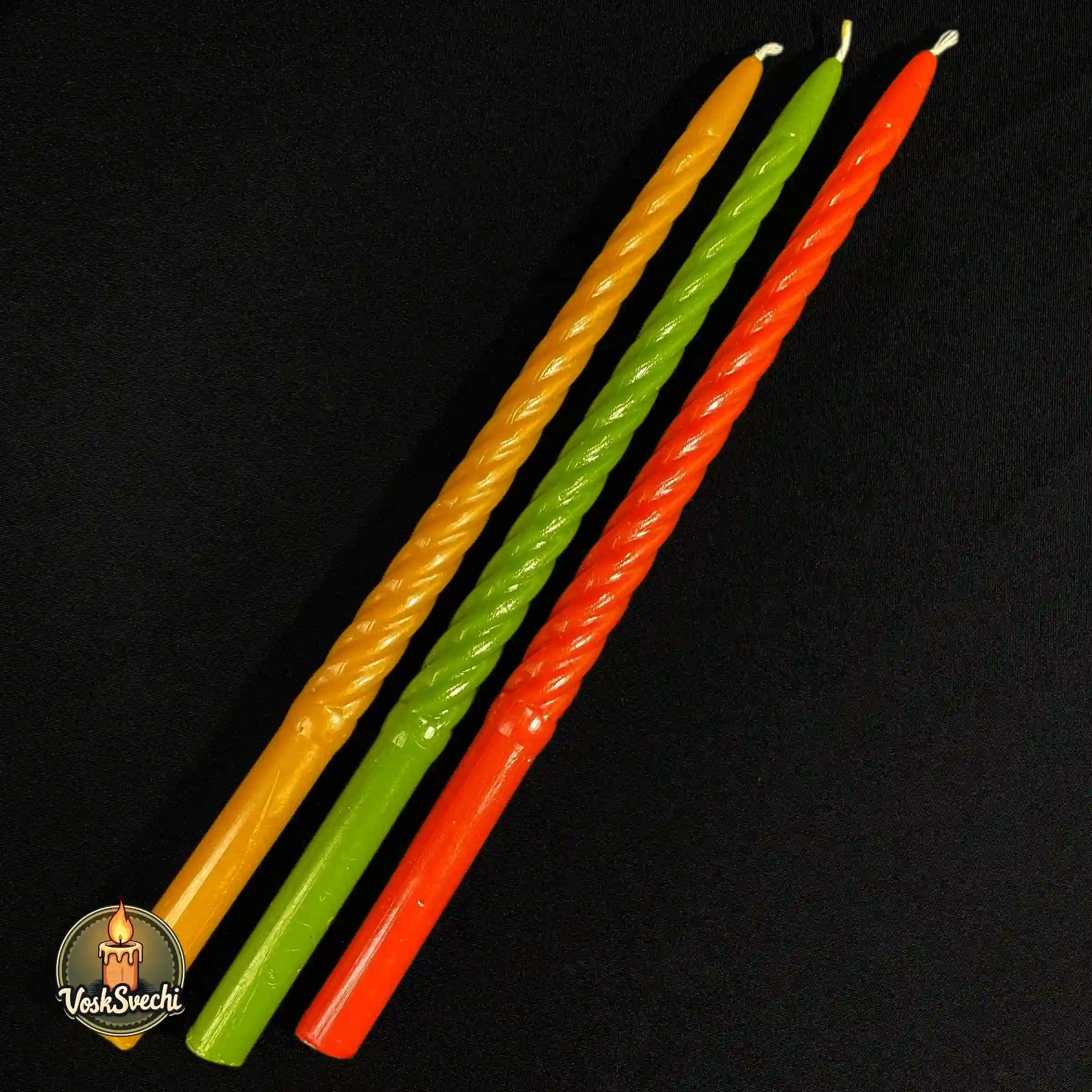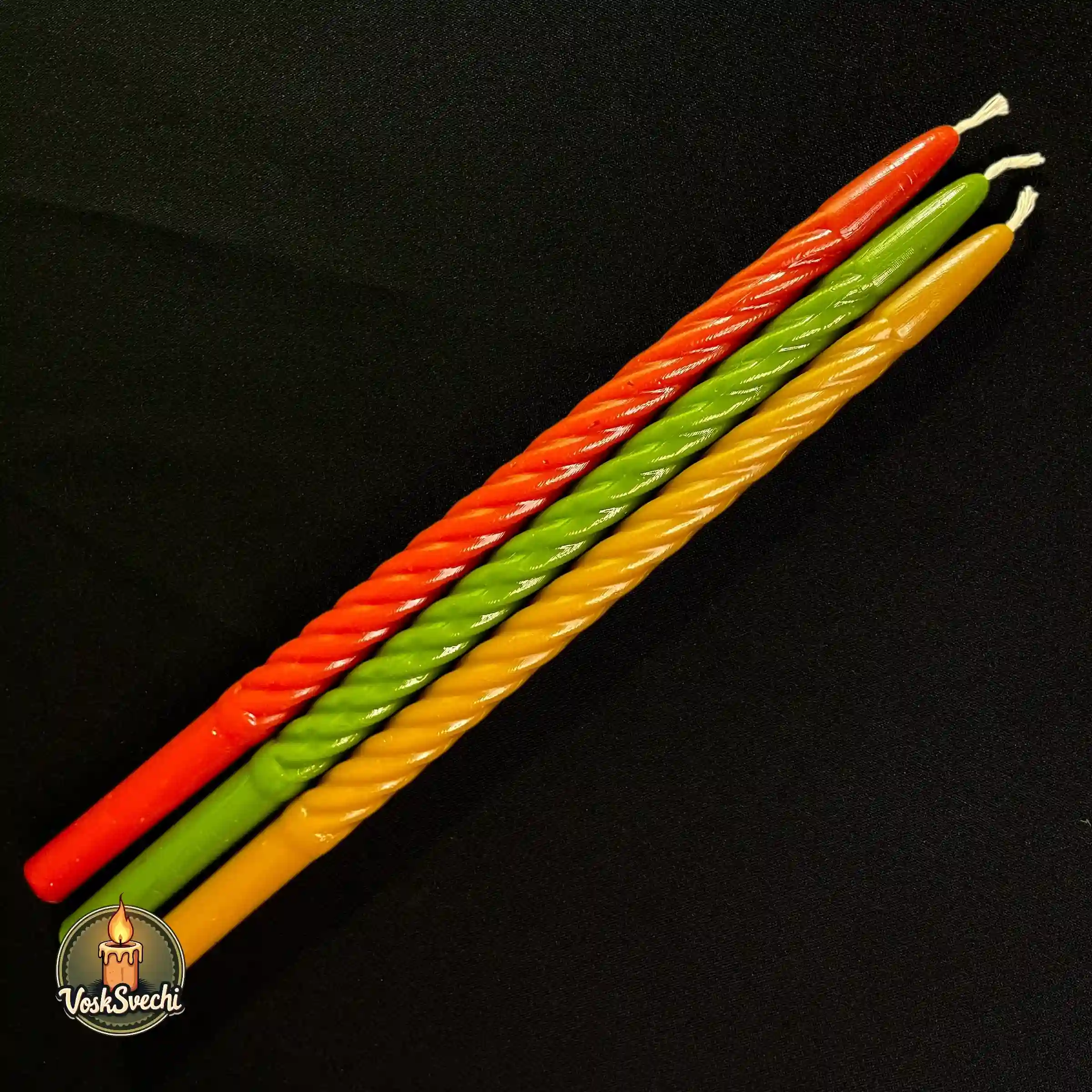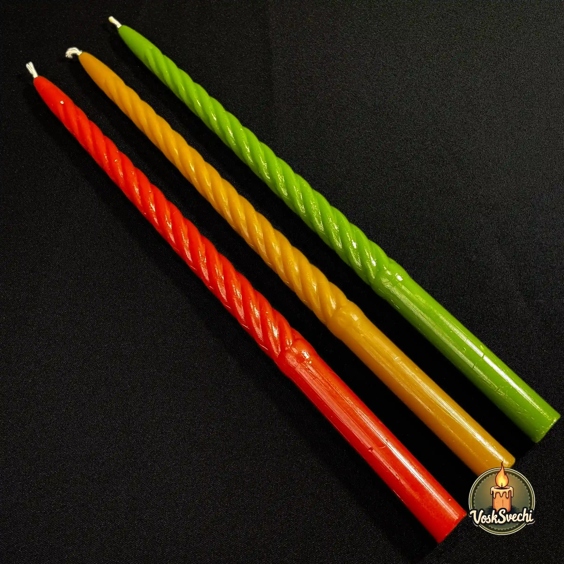 Додайте яскравих барв та весняного настрою до свого свята з ексклюзивною серією від VoskSvechi. Наші воскові свічки «Святкові кручені» створені спеціально до Великодня. Це унікальний мікс трьох насичених кольорів: символічного червоного, сонячного жовтого та свіжого зеленого. Виготовлені з чистого воску, вони випромінюють густий медовий аромат, наповнюючи оселю справжньою святковою благодаттю.